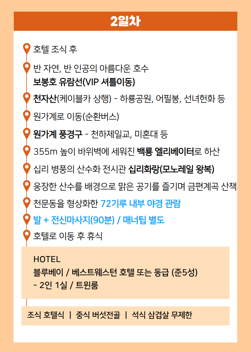 ▪️황석채($50/인), 천고정쇼($50/인), 발+전신마사지($50/인), 칠성산($70/인), 공중정원($50/인)