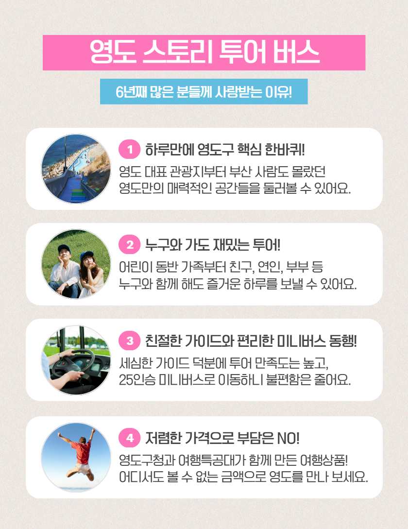 아직 여름이 한참이라 더운 날씨~ 그리고 오락가락 하는 비 때문에 조금 아쉬운 날씨긴 했지만 엄청 친절하시고 사진도 잘 찍어주시는 가이드 선생님과 함께 7시간의 영도 투어도 잘 다녀왔습니다~ 아이와 함께 다니기에도 빡시지 않은 스케줄이고 중간 중간 자유 시간이 주어져서 모이는 시간 맞춰 돌아 다닐 수 있으니 힘들면 쉴 수도 있고 좋더라구요~ 특히 일요일 기준 이 가격으로 하루 패키지라니~~ 너무 좋은 거 같아요 ㅎㅎ 다음에 조금 덜 덥고 하늘이 맑은 날 다른 투어도 또 다녀오려구요!!