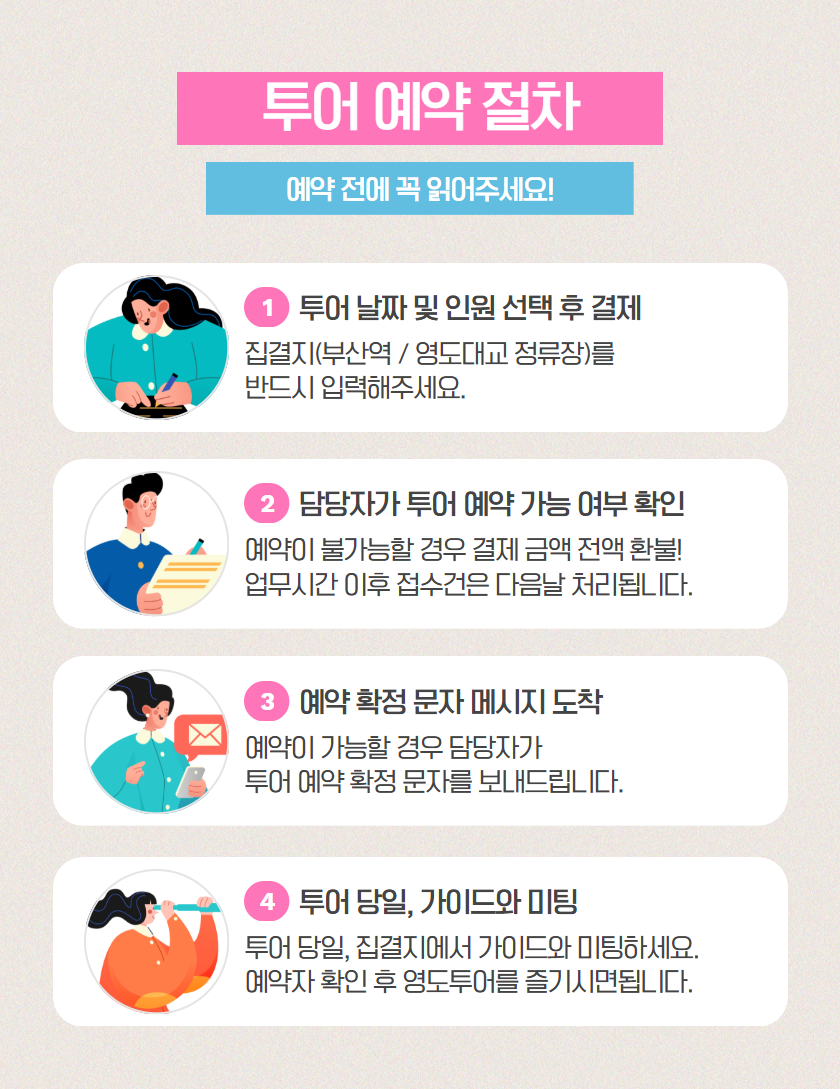 올해 친정엄마와 일본을 5일 갈 지, 부산을 2주 갈지 고민하다가 영도 바다와 싱싱한 해산물을 맛보여드리고 싶어서 부산으로 선택했고, 일주일 간격으로 오륙도 남구투어와 절영마 투어를 각각 주말에 예약했다. 일주일 간격으로 예약한 이유는 엄마와 내가 체력이 좋지 못하기 때문에 (임산부+60대엄마) 일주일에 1개의 투어만 신청했다.