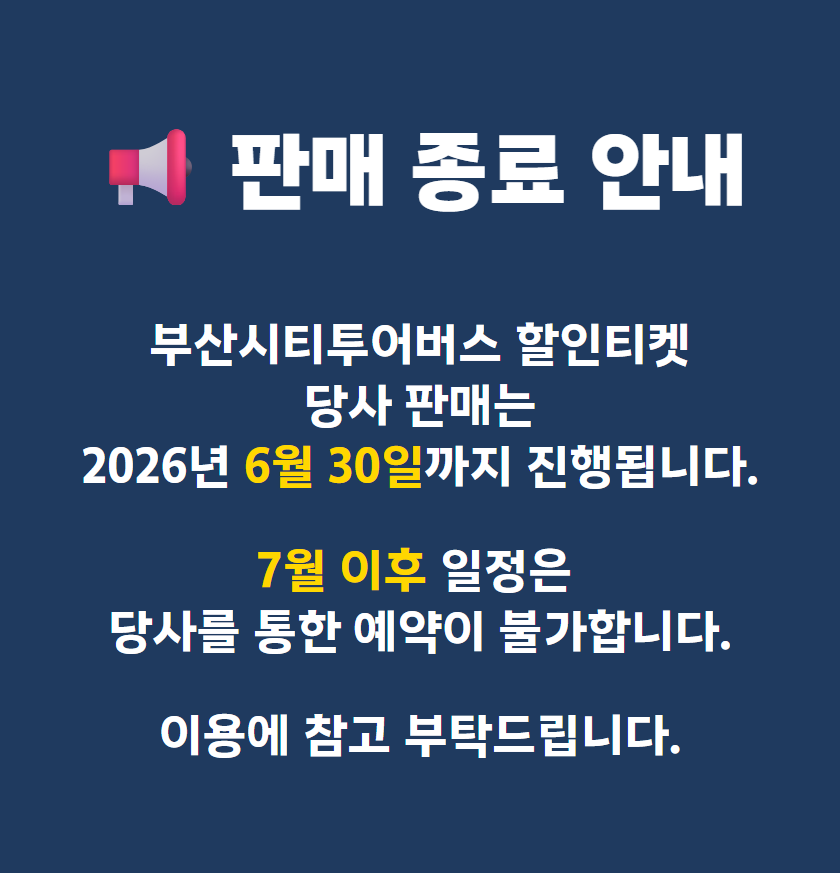 · 부산시티투어버스는 무조건 선착순 탑승이라 주말 공휴일 및 휴가철 등에는 이용객이 많습니다. 당연히 대기시간이 길어질 수 있으며 교통체증 발생 시 운행시간도 많이 지연됩니다. 당사는 이에 대한 책임이 없음을 알려드립니다.