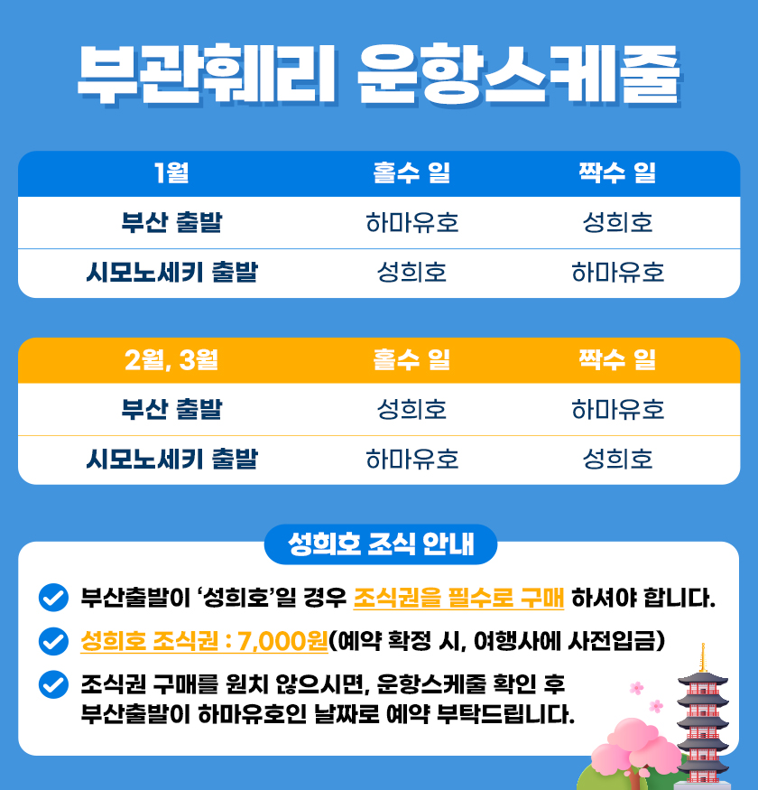 ㄴ시모노세키 출발 : 성희호 20,000원 / 하마유호 2,000엔