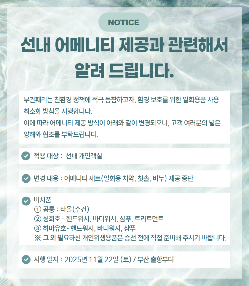 A.2023년 7월 21일부터 선사의 지침으로 부산 출발 성희호 승선시에는 조식을 필수로 구매하셔야 합니다.