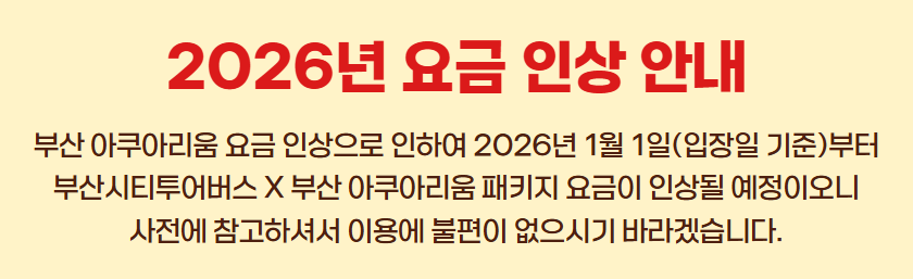 ¶ 부산아쿠아리움은 유료 대인 1명당 36개월 미만 유아 1명만 무료입니다(연령 확인 서류 필요합니다). 무료 입장에 해당하지 않는 유아에 대해서는 부산아쿠아리움 입장 시 현장에서 소인권으로 구매하십시오.