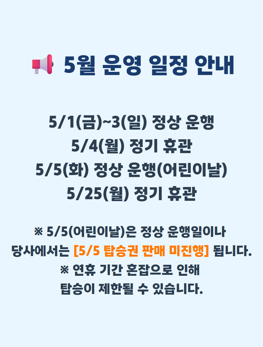 · 수/목/금/토/일/공휴일 : 09시 45분부터 하루 9회 운행
