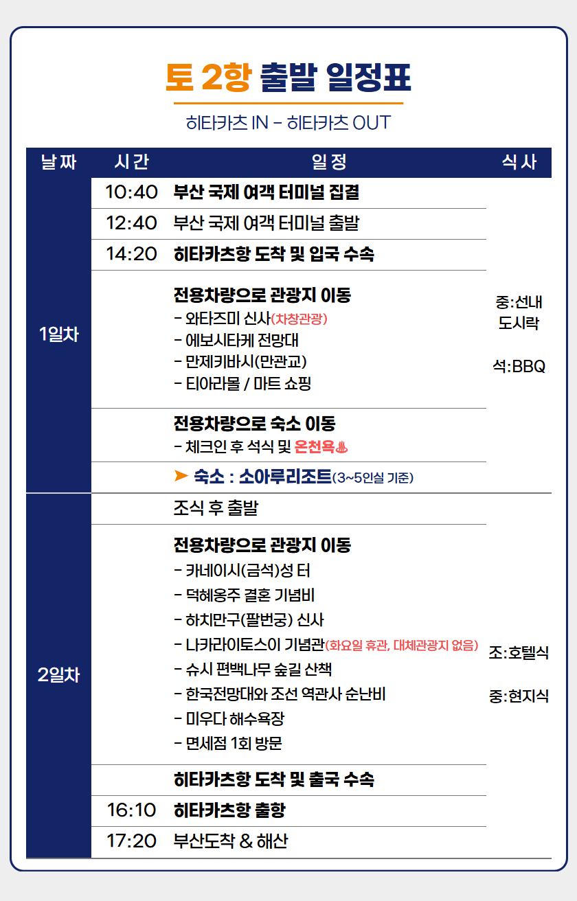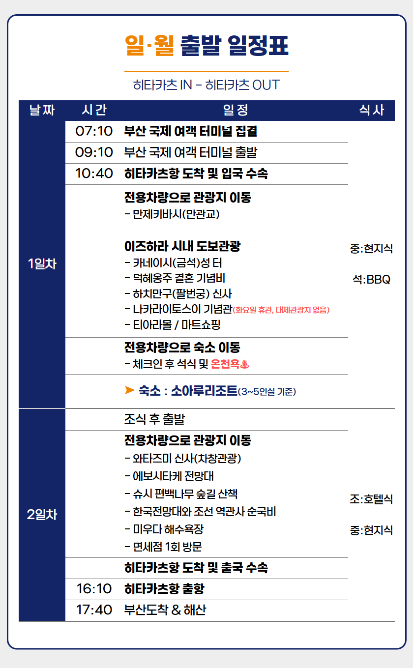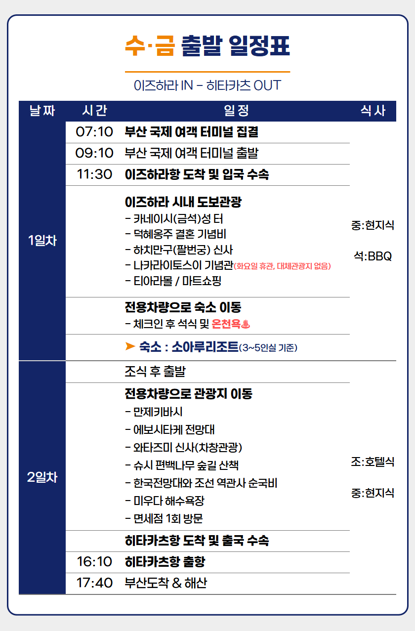 ✔ 대마도 여행 중 기상 악화로 귀국편이 결항될 경우, 현지 체류로 인해 추가 발생하는 숙박비 및 식비 등 모든 비용은 고객 부담입니다.