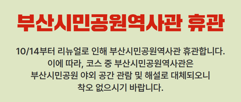 ★10/14 부터 부산시민공원역사관 리뉴얼로 휴관(야외 공간 관람으로 대체)