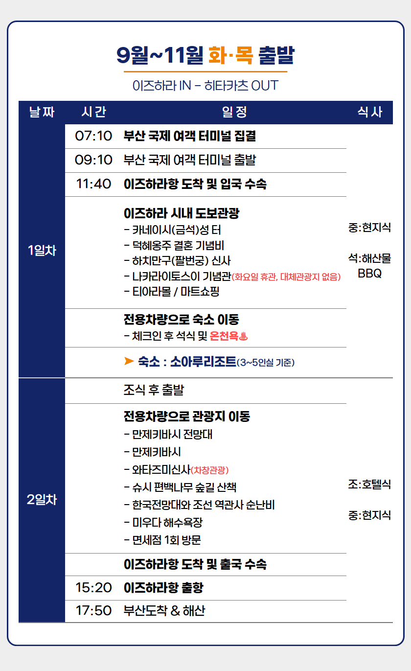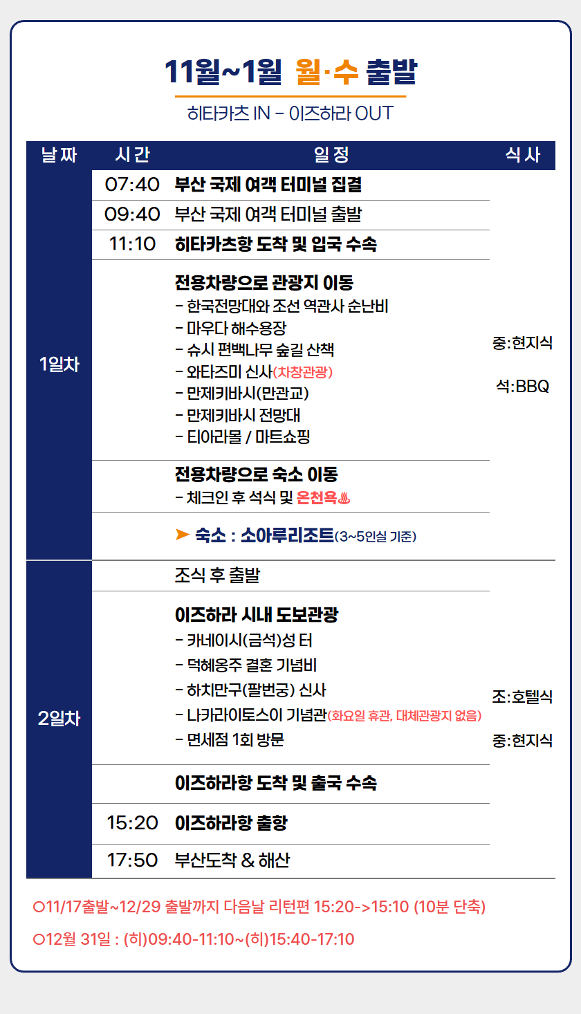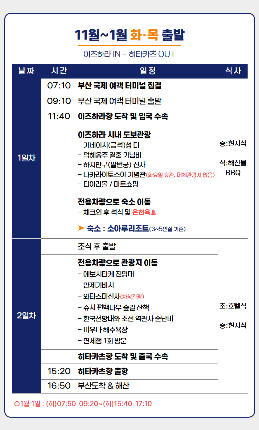 ✔ 대마도 여행 중 기상악화로 돌아오는 편이 결항 시, 현지에서 연장되는 모든 숙식료는 고객부담입니다.