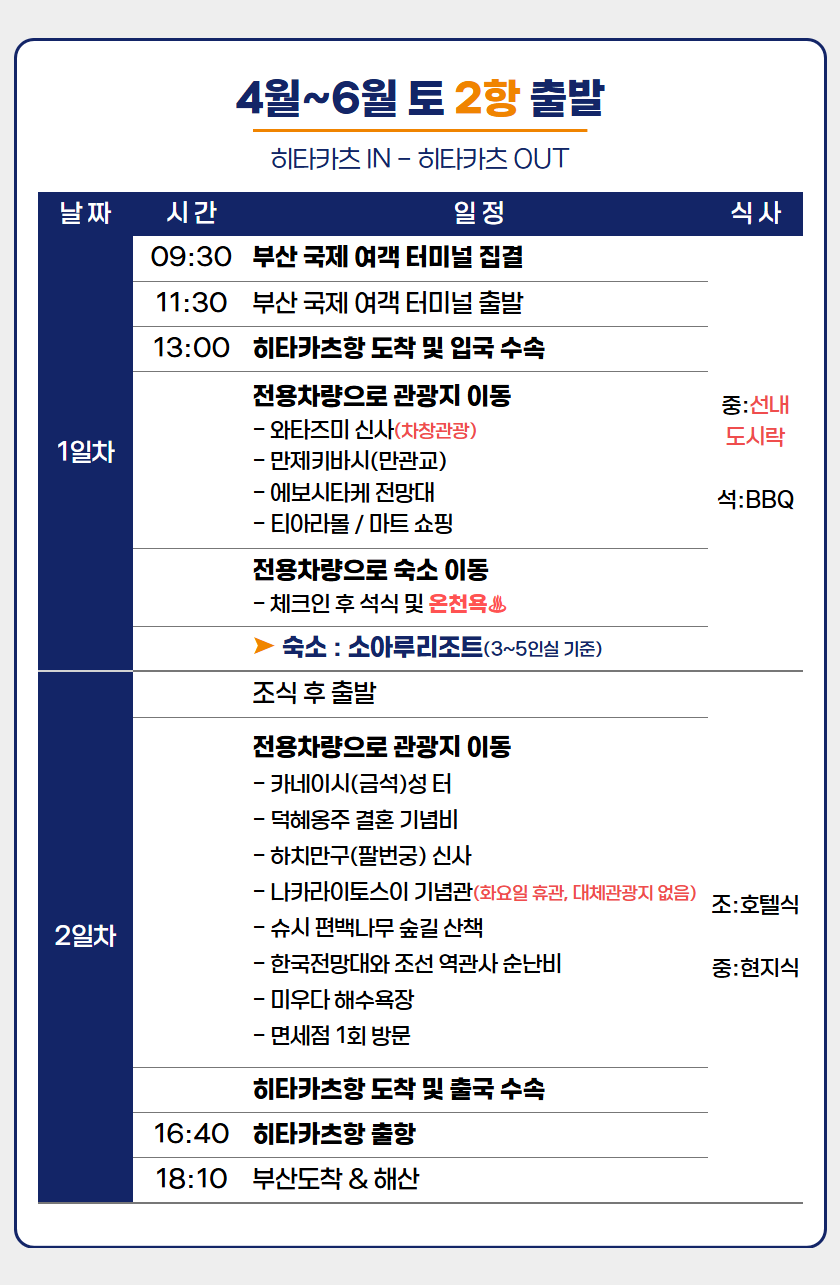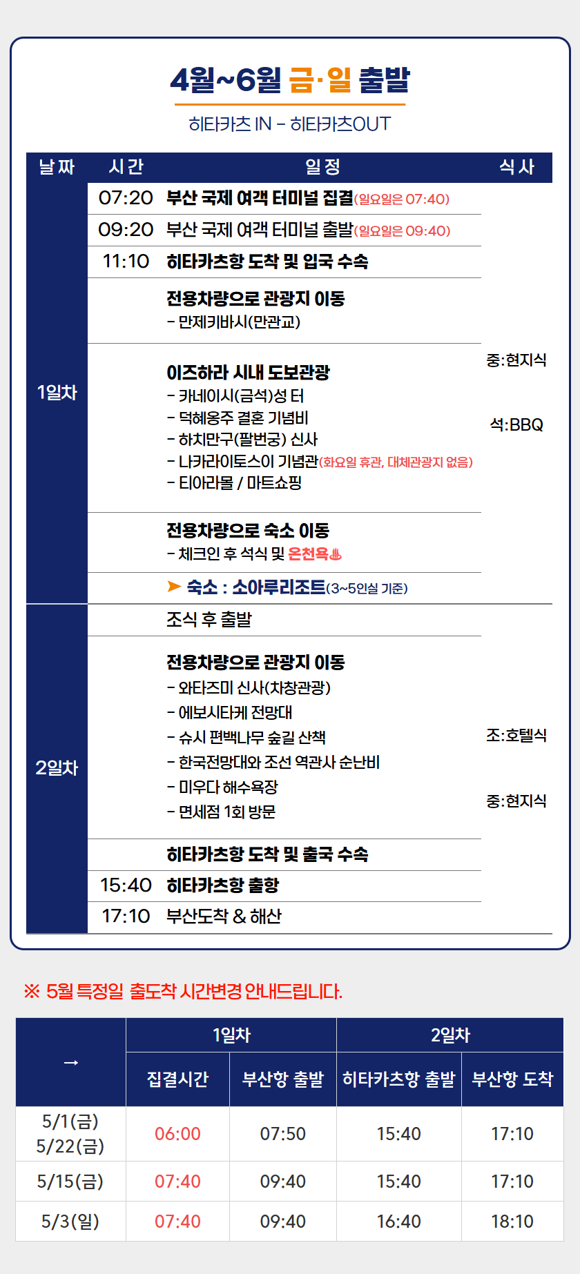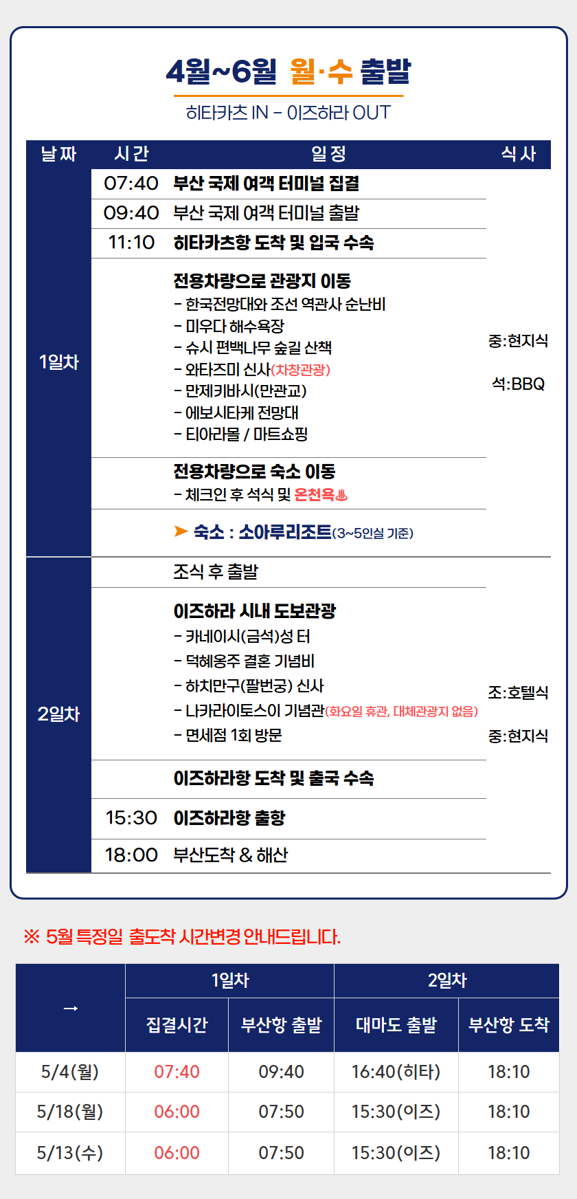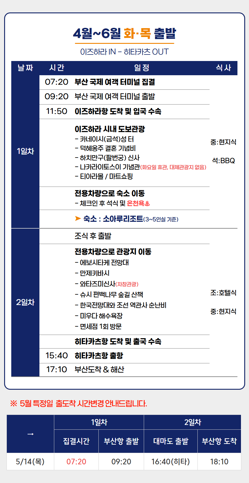 ✔ 대마도 여행 중 기상 악화로 귀국편이 결항될 경우, 현지 체류로 인해 추가 발생하는 숙박비 및 식비 등 모든 비용은 고객 부담입니다.