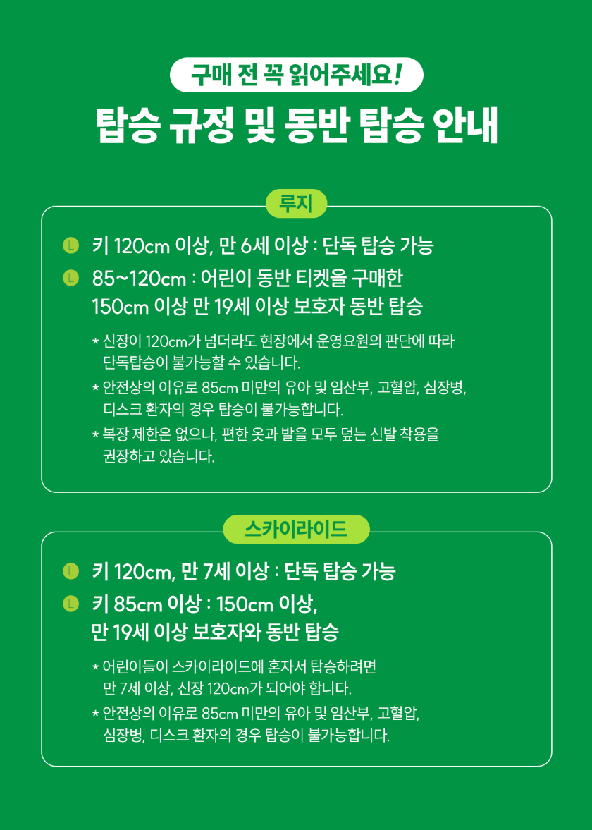 ※ 신장이 85~120cm 고객님의 경우 동반 탑승이 가능하며, 현장에서 동반권을 추가 구매하실 수 있습니다.